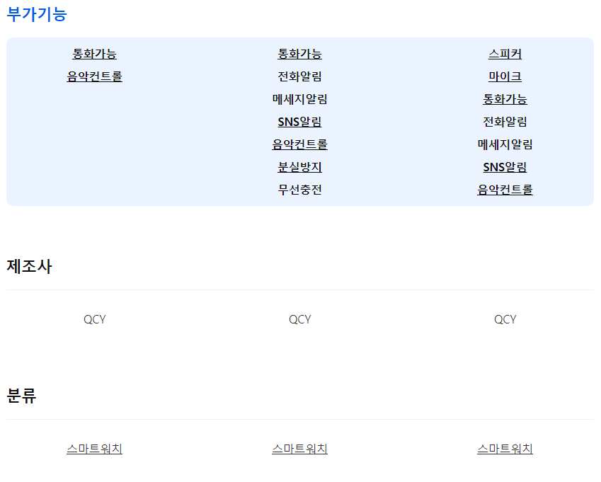 [기능] 통화가능 / 전화 알림 / 메시지 알림 / SNS 알림 / 음악컨트롤 / 분실방지 / 무선충전 / IPX7