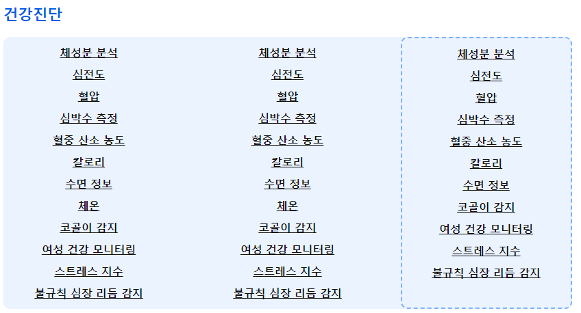 - 공통: 심전도, 혈압, 심박수 측정, 혈중 산소 농도, 칼로리, 수면 정보, 여성 건강 모니터링, 스트레스 지수, 불규칙 심장 리듬 감지