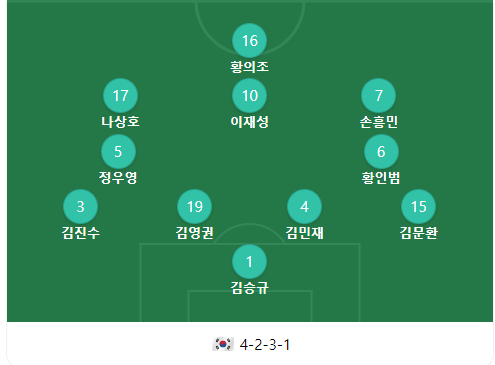 선발 출전 명단은 황의조, 나상호, 이재성, 손흥민, 정우영, 이재성, 황인범, 김진수, 김영권, 김민재, 김문환, 김승규입니다.