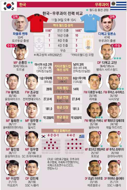대한민국, 우루과이 선발 출전 명단 및 전술