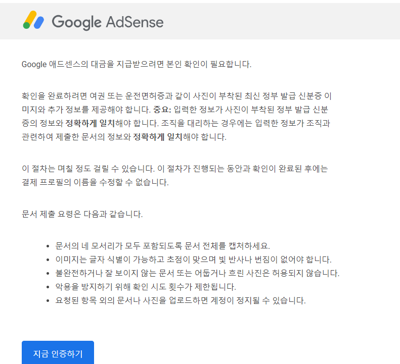 애드 센스의 대금을 지급받으려면 본인 확인이 필요하다고 하니 한시라도 빨리 해결해야겠습니다!