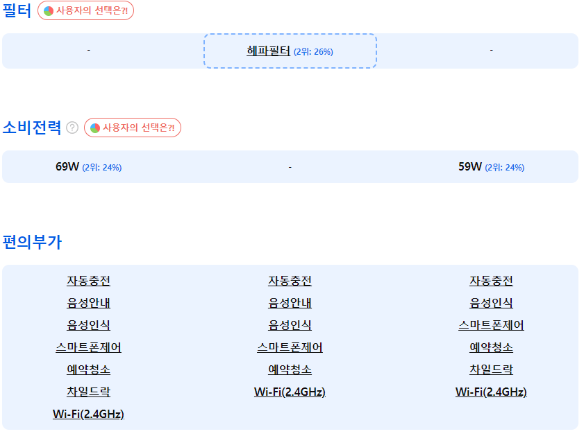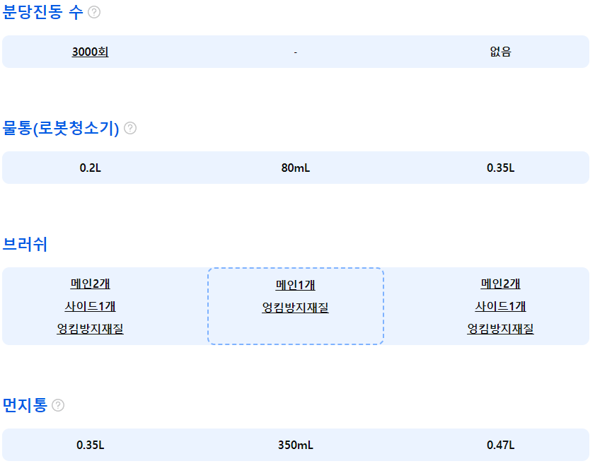 [진공청소]브러쉬:메인2개,사이드1개,엉킴방지재질/청소운전:격자,꼼꼼/금지구역/구역지정/구역순서/카펫부스트/흡입력조절/진공후물걸레/브러쉬리프팅/먼지통:0.35L/청소면적:300㎡/사용시간:3시간/충전시간:4시간/소비전력:69W/소음:67dB/