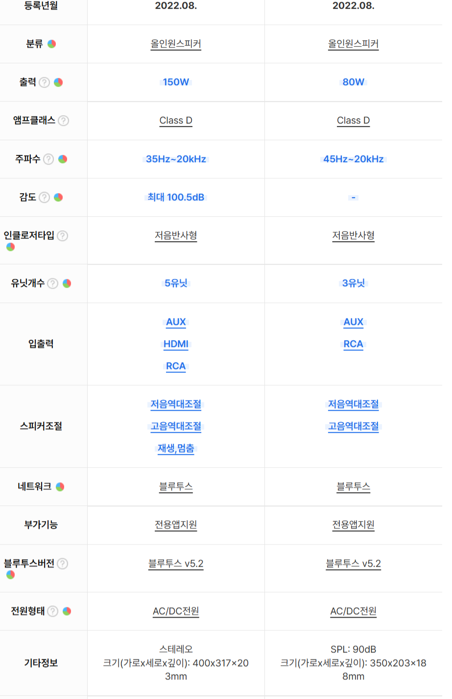 | 출력 | 150W (저음 90W, 중음 30W, 고음 30W) | 80W (저음 50W, 고음 30W) |
