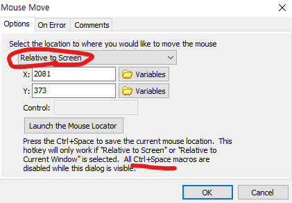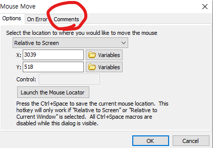 마우스의 좌표를 X축 Y축의 값을 입력해줘야 합니다. 하지만 한 번에 외우기가 힘들기에 밑줄 친 컨트롤+스페이스를 누르면 자동으로 입력이 됩니다.