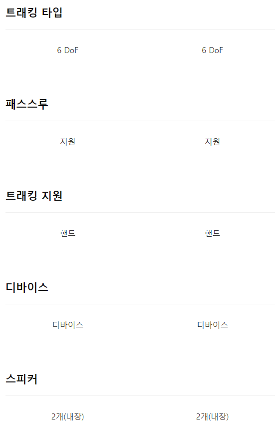 트래킹 6 DoF / 패스스루: 지원 / 트래킹 지원: 핸드 /
