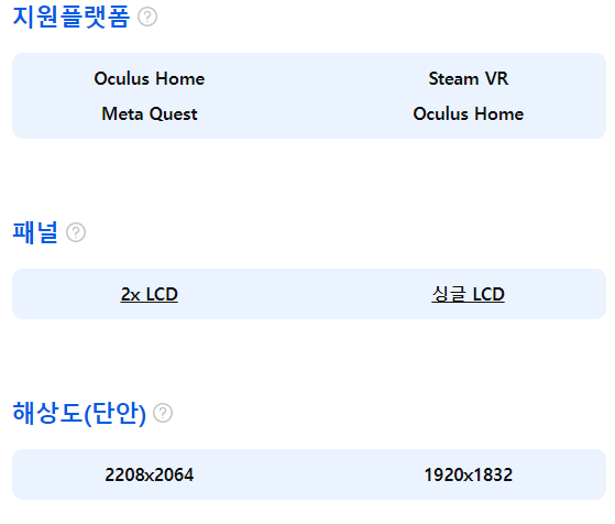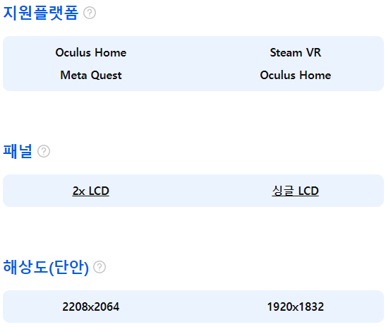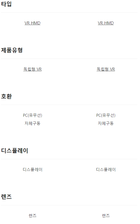 VR HMD / 독립형 VR / 호환: PC(유무선), 자체구동 /