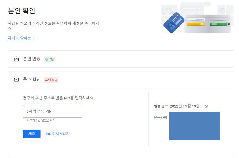 애드 센스 상에서는 2022년 11월 19일 우편을 발송했다고 나옵니다.