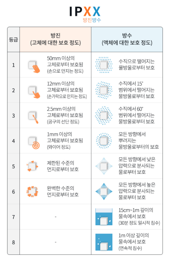 IPX 등급이라고 들어보셨나요? 숫자가 높을수록 방수 능력이 좋아요.