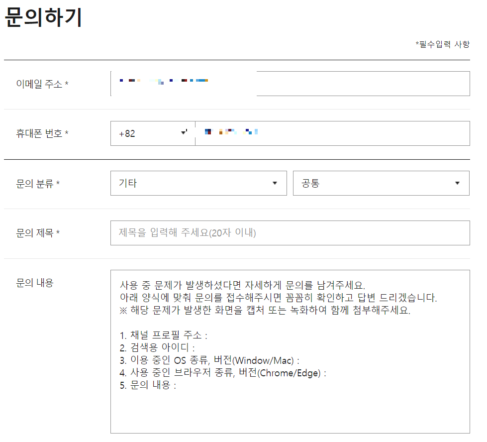 문의 분류를 기입하면 내용 부분에 자동으로 필수 항목을 입력할 수 있도록 되어 있습니다.