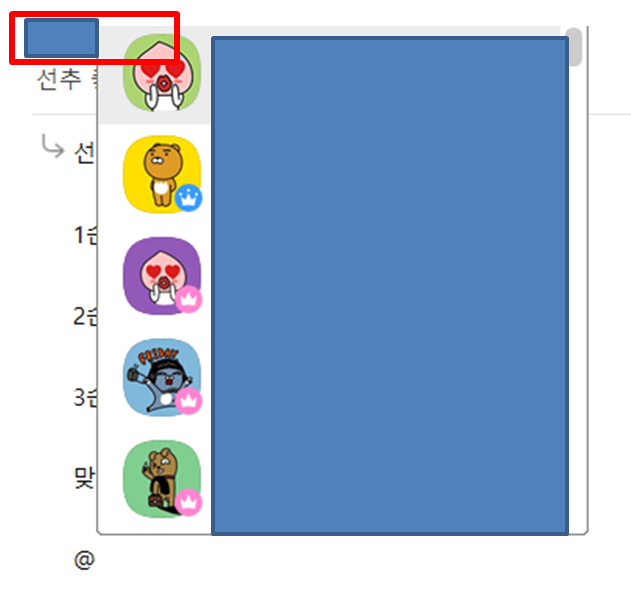 (답장 기능을 사용했기 때문에 빨간 네모칸 안에 (개인정보로 마스킹해서 캡처에는 안 보이지만) 파란 글씨로 되어있는 대화명을 타이핑하면 됩니다.)