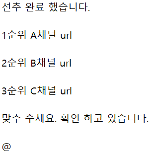 16. 선추 방식으로 하다가 현 시각에 활동하는 거의 모든 사람을 추가했다면 1순위 2순위 3순위를 내가 먼저 선추 하는 것이 아닌 선추를 기다리는 방식으로 바꿉니다. 아래 네모칸 글처럼 변경해서 채팅방마다 복사 붙여 넣기를 합니다. 그러면 선추 하기 기다리는 사람들이 나를 선추 하고 멘션을 주게 되고, 답장이나 멘션 따라가서 맞추를 해주는 방식으로 진행하면 됩니다.