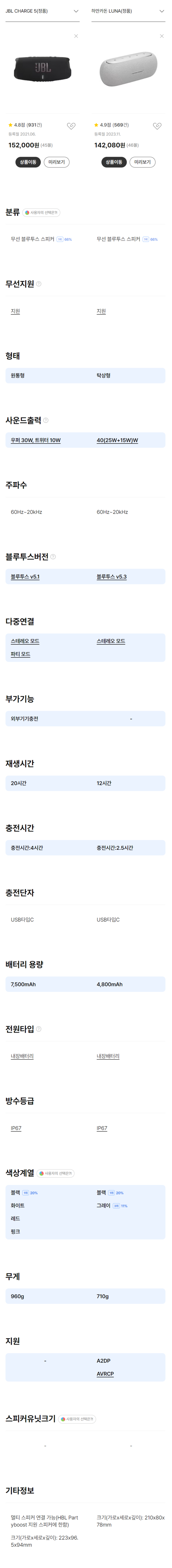 | 스펙 | JBL CHARGE 5 | 하만카돈 LUNA |