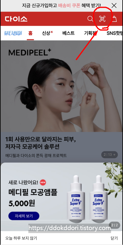 1. 다이소 어플 첫 화면 상단의 큐알 코드를 터치 합니다.