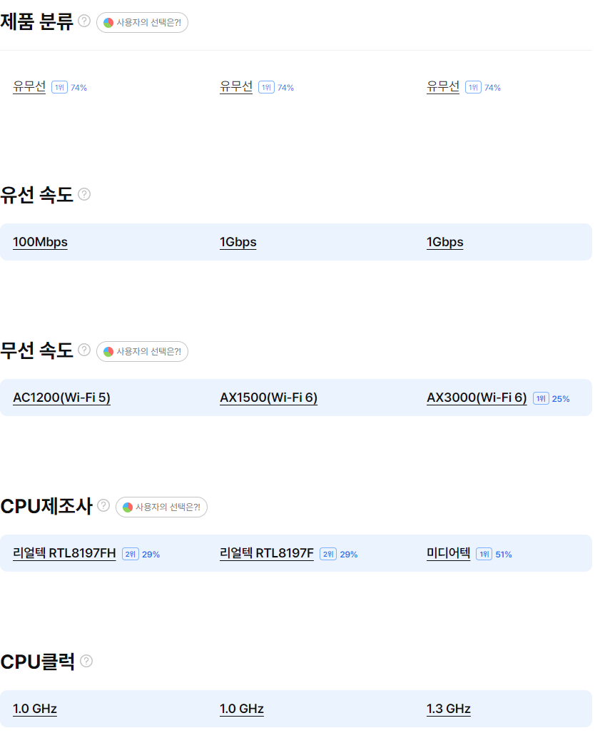 유무선/1Gbps/AX1500(Wi-Fi6)/최고무선속도:1.2Gbps/라우터형/전원플러그형/리얼텍RTL8197F/싱글코어/1.0GHz/RAM:DDR3128MB/FLASH:16MB/WAN:1포트(1Gbps)/LAN:4포트(1Gbps)/듀얼밴드/안테나:4개/Mesh/MU-MIMO/IPTV지원/WOL/모바일관리어플/VPN/QoS/빔포밍/모바일UI/OFDMA/무상2년