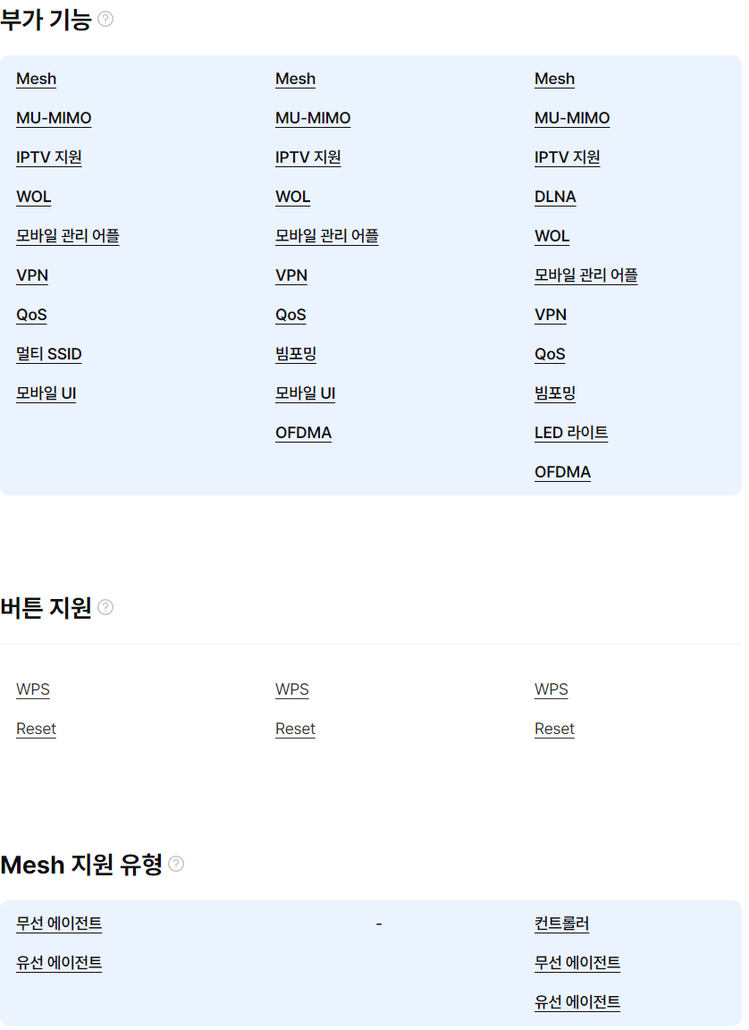 유무선/1Gbps/AX3000(Wi-Fi6)/최고무선속도:2.4Gbps/라우터형/전원플러그형/미디어텍/듀얼코어/1.3GHz/RAM:DDR3256MB/FLASH:128MB/WAN:1포트(1Gbps)/LAN:4포트(1Gbps)/USB3.0:1개/듀얼밴드/안테나:5개/Mesh/MU-MIMO/IPTV지원/DLNA/WOL/모바일관리어플/VPN/QoS/빔포밍/LED라이트/OFDMA/컨트롤러/무선에이전트/유선에이전트/무상2년