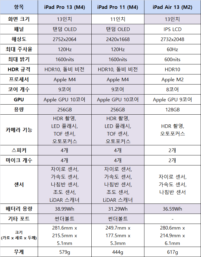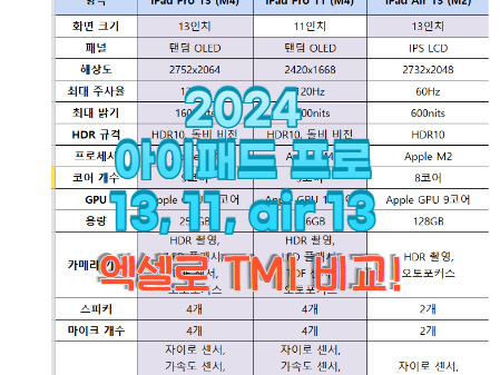 아이패드 프로 13 프로11 에어13 차이점만 비교 표